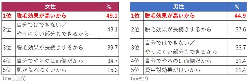 脱毛サロン・クリニックの利用理由1位は男女とも「脱毛効果が高いから」。上位4位までは男女共通。