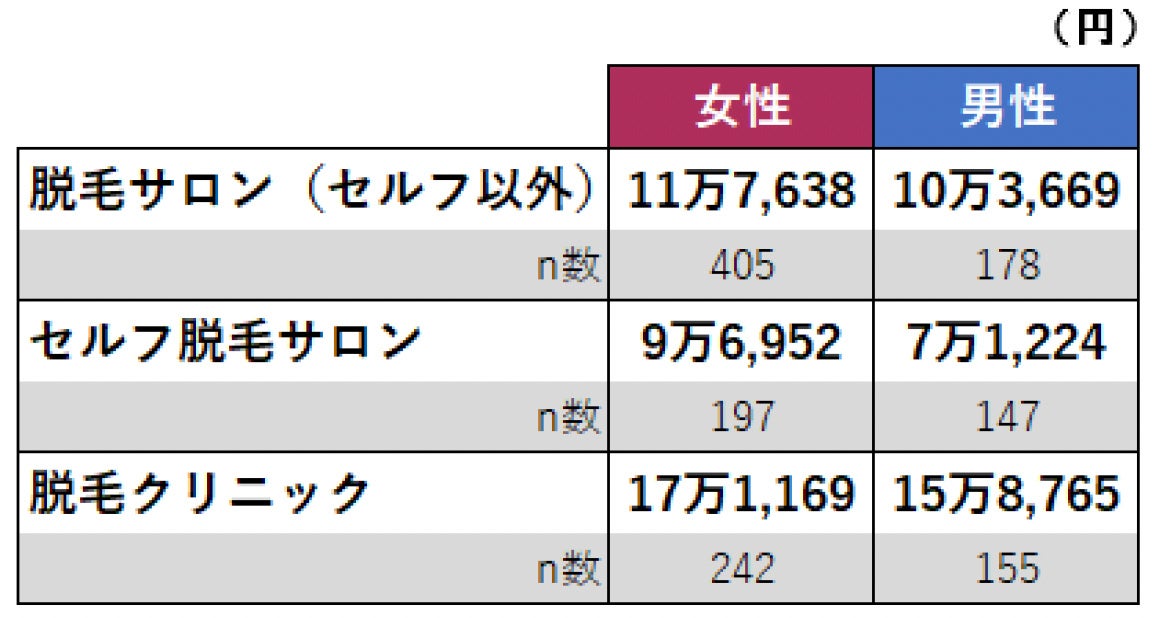 男女とも最も多いのが「脱毛サロン(セルフ脱毛以外、以下セルフ以外と表記)」で、女性は11.6%で男性は5.1%。次いで「脱毛クリニック」(女性6.9%、男性4.4%)、「セルフ脱毛サロン」(女性5.6%、男性4.2%)と続く。年間利用金額が最も高いのは、男女とも「脱毛クリニック」(女性17万1,169円、男性15万8,765円)。