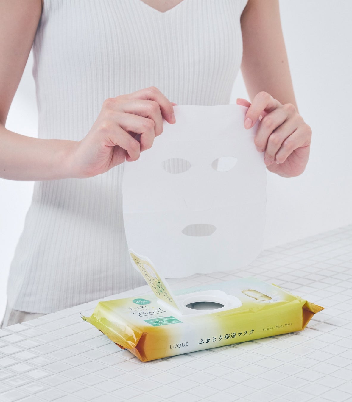 厚みのあるフェイス型のシートマスクに、化粧水をたっぷり含ませた「ルクエ ふきとり保湿マ