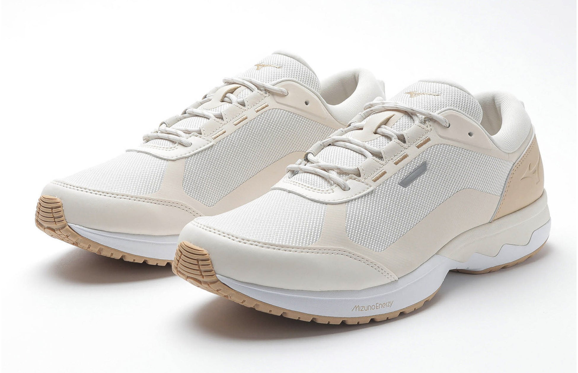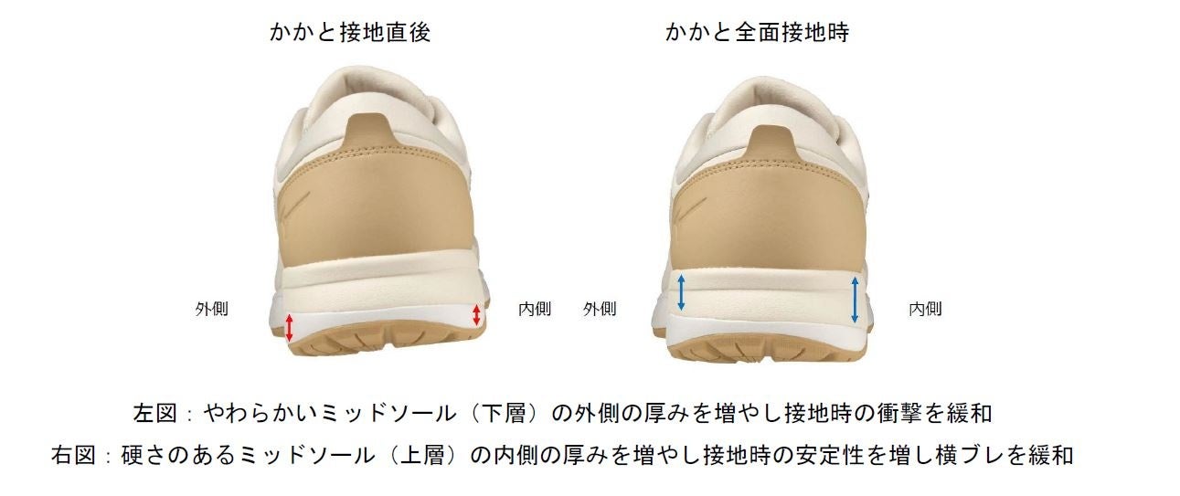 これにより接地時のクッション性と安定性の向上を追求しています。さらにミッドソールには、やわらかく反発性の高い素材『MIZUNO ENERZY FOAM』を採用しました。これらを組み合わせることにより、後足部では接地時の衝撃を緩和し、接地から蹴りだしに向けてスムーズな体重移動を実現します。また、前足部にも『MIZUNO ENERZY FOAM』を搭載することで、より力強い蹴りだしが可能になり、接地から蹴りだしまでのスムーズな歩き心地を追求しています。