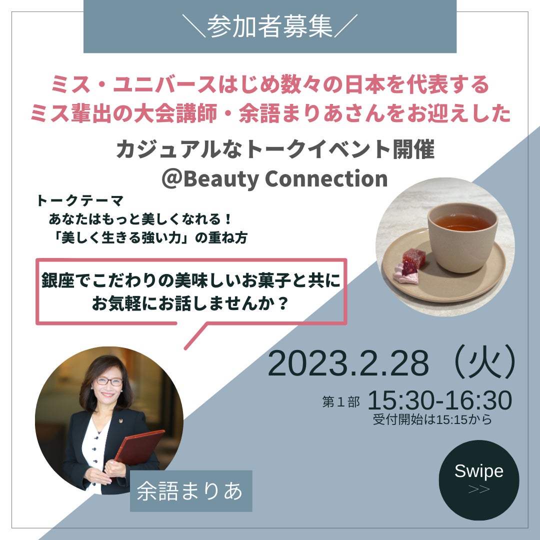 「Beauty Connection Ginza (ビューティーコネクション銀座)」(運営会社:株式会社 MTG )は、来たる2023年2月28日(火)に、MDNA SKINの9周年を記念し、ミス・ユニバースはじめ数々の日本を代表するミス輩出の大会で講師を務められた「余語まりあ」さんを迎え、カジュアルなトークイベントを開催いたします。気になるトークテーマは ”あなたはもっと美しくなれる!「美しく生きる強い力」の重ね方 。”
