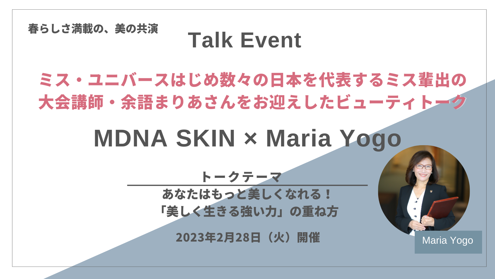 「Beauty Connection Ginza (ビューティーコネクション銀座)」(運営会社:株式会社 MTG )は、来たる2023年2月28日(火)に、MDNA SKINの9周年を記念し、ミス・ユニバースはじめ数々の日本を代表するミス輩出の大会で講師を務められた「余語まりあ」さんを迎え、カジュアルなトークイベントを開催いたします。気になるトークテーマは ”あなたはもっと美しくなれる!「美しく生きる強い力」の重ね方 。”