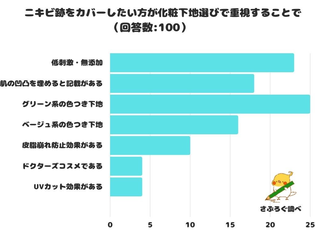 ニキビ跡をカバーしたい方が化粧下地選びで重視することをアンケートにて調査したところ、1位は「グリーン系の色つき下地」でした。