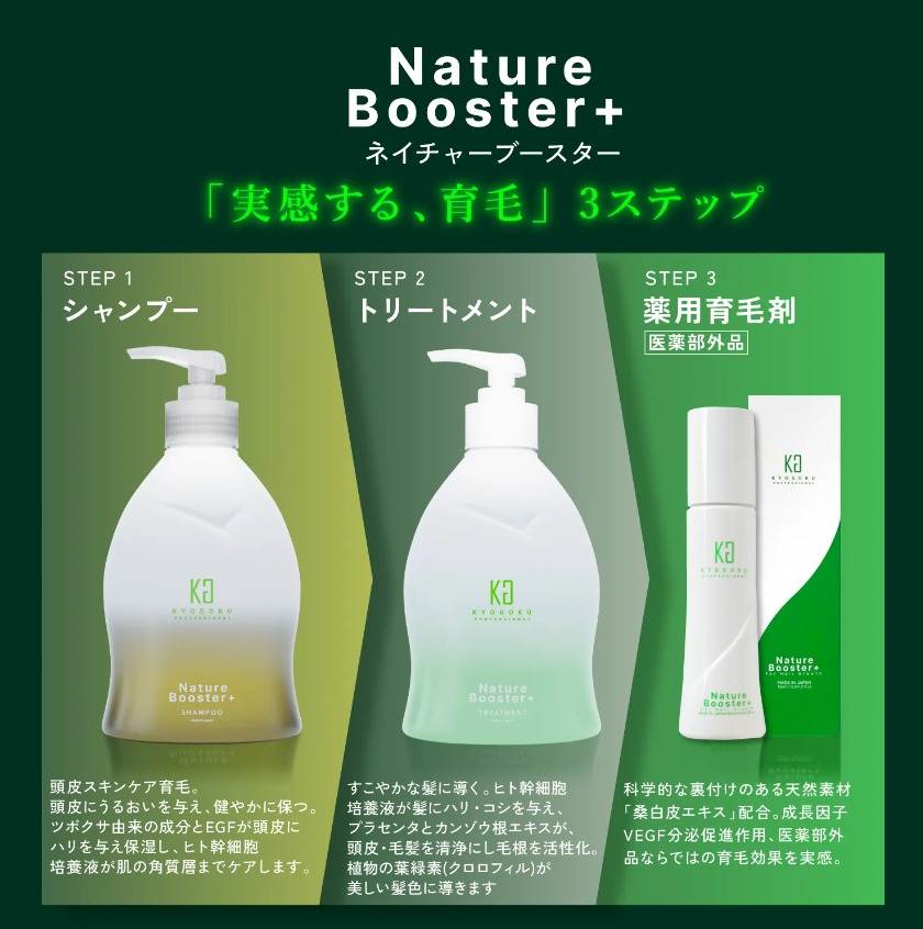 この度、「KYOGOKU PROFESSIONAL」より販売しております「ネイチャーブースター」薬用育毛剤が大変好評でしたので、シャンプーとトリートメントの開発に至りました。
