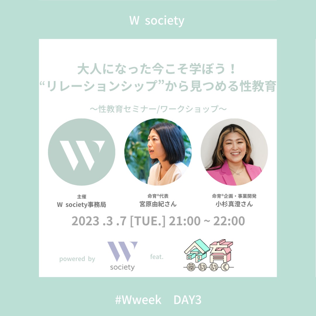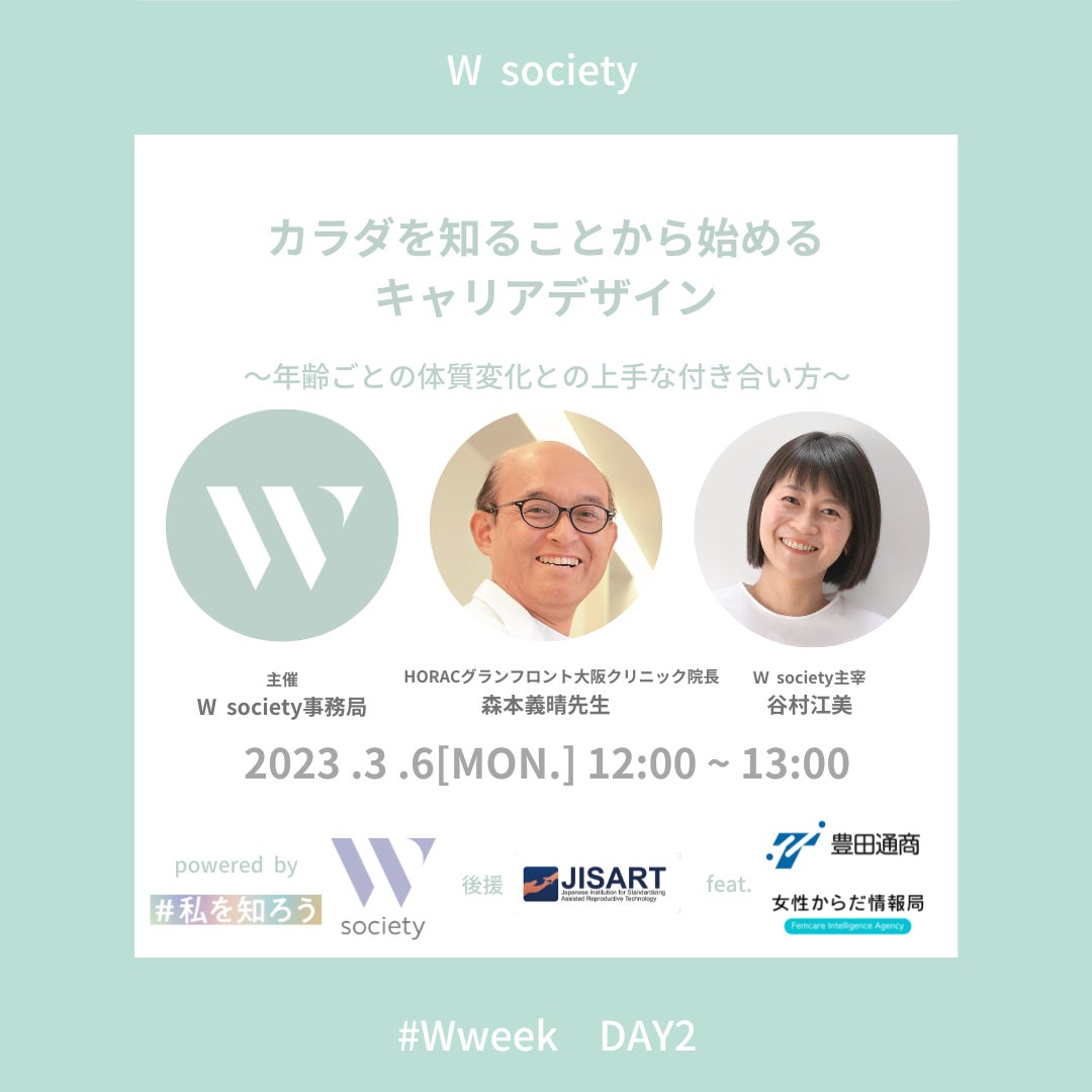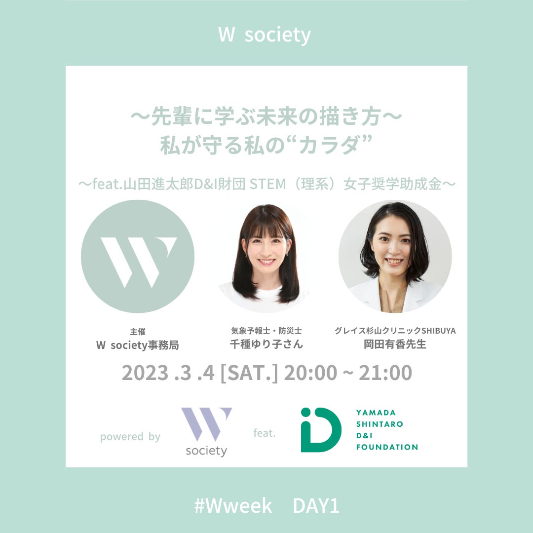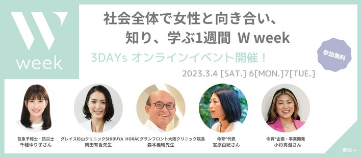 今年の「W week」初日は、公益財団法人山田進太郎D&I財団の特別協力のもと、STEM(理系)分野に興味を持つ中学生から大学生女子に向けた進路・キャリアと自分のカラダについて学ぶライフデザインセミナーを開催。2日目は、一般社団法人JISART後援、豊田通商株式会社、女性からだ情報局の特別協力のもと、大阪エリアに拠点のある企業や働く女性に向けて、ライフデザインセミナーを開催。3日目は、医師や専門家、クリエイターからなる性教育情報サイト「命育®」の特別協力のもと、性教育の土台となるリレーションシップや、多様性・ジェンダーのあり方を大人自身も学び、考えるセミナー/ワークショップを開催します。いずれのイベントにも、ゲストに医師や専門家など様々な分野で活躍されているエキスパートをお招きし、セミナーやワークショップを通じて、多角的な視点から、女性のカラダと心の今を知り、学ぶ機会を提供します。