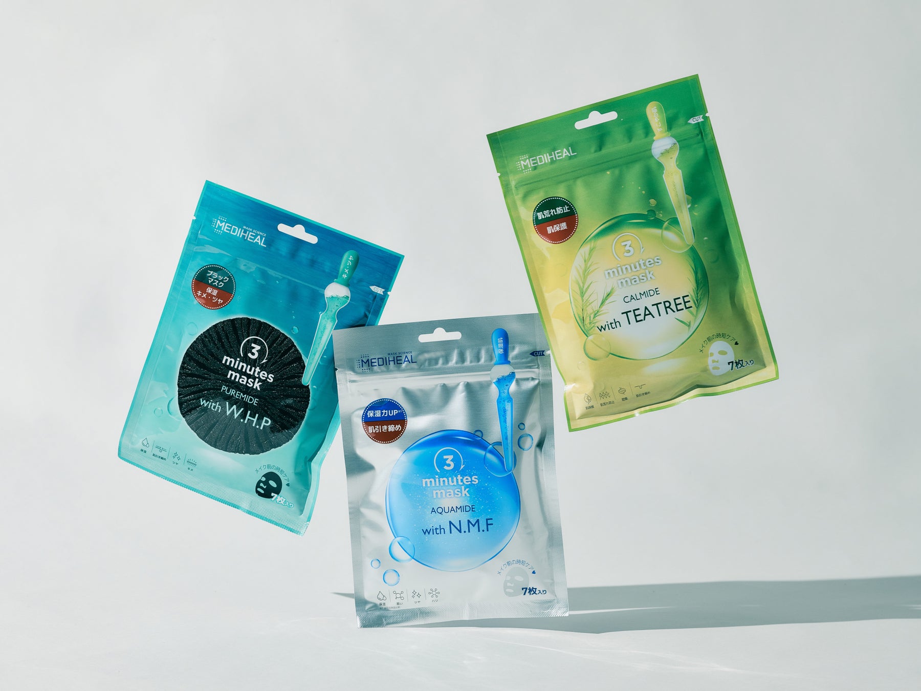 「1日1マスク、1回3分で完了のスピーディーケア」「忙しい朝・疲れた夜にメディヒールの時短マスク」をコンセプトとした商品です。メディヒール商品において認知・人気の高い3種類の個包装タイプシートマスクを、より気軽にお使いいただけるディリーケア用の大容量タイプマスクとして2021年2月に日本限定商品として発売しました。さっと3分で時短ケアができる商品となっているため、忙しい朝や疲れた夜のスキンケアとして使用することも可能です。さっぱりした使用感となっているため、朝のメイク前にメイクヨレを気にすることなく使用できる点も魅力の一つです。