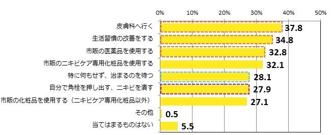 ニキビができてしまった時の対処法は、「皮膚科へ行く」(37.8%)、「生活習慣の改善をする」(34.8%)、「市販の医薬品を使用する」(32.8%)が上位3項目という結果になりました。一方で、約3割が「自分で角栓を押し出す、ニキビを潰す」(27.9%)と回答。(グラフ2)