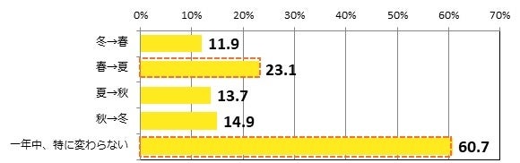 ニキビができやすい、悪化しやすい季節について問う設問では、6割が「一年中、特に変わらない」(60.7%)と挙げる他、4人に1人が「春→夏」(23.1%)と感じていることがわかりました。 (グラフ8)