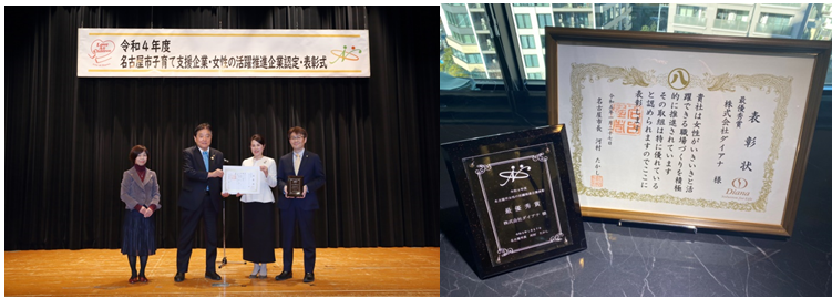 プロポーションづくりの総合コンサルティング企業、株式会社ダイアナ(東京都渋谷区、代表取締役会長 兼 社長: 徳田充孝、以下ダイアナ)は、2023年1月27日に令和4年度名古屋市「女性の活躍推進企業」として最優秀賞に選ばれ表彰されました。