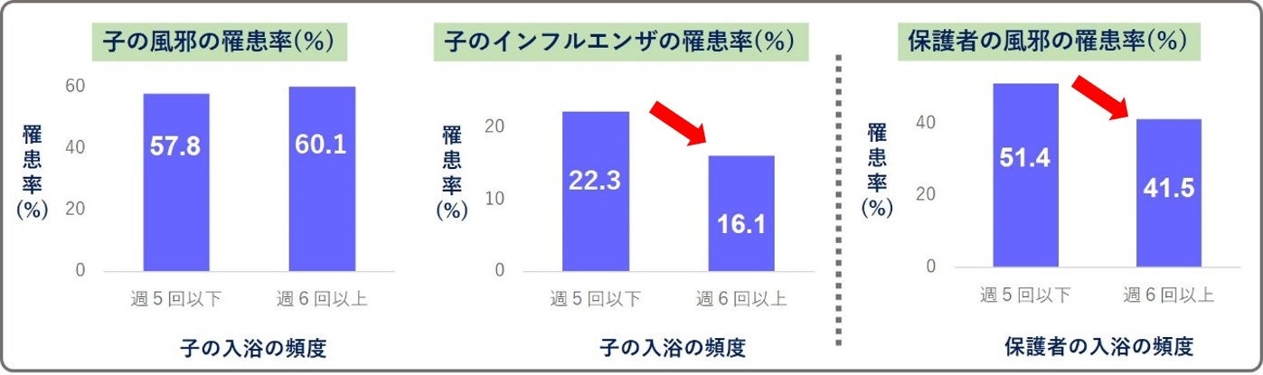 本調査の結果から、浴槽入浴の回数が多いと風邪やインフルエンザの罹患が少ない傾向にあり、過去の基礎研究と矛盾していない可能性が示されました。