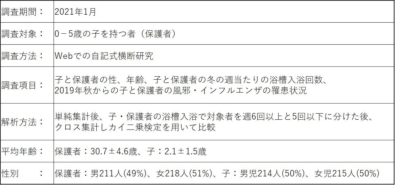 入浴と風邪の発症の関連については、基礎研究で入浴が温熱作用によって一部のリンパ球の活性化など免疫機能への好影響を示唆する結果はあるものの、疫学調査報告は多くなく、特に子どもに対する調査は少ないのが現状です。そこで、東京都市大学と共同で、0 – 5歳の子ならびにその保護者を対象に、入浴習慣と風邪・インフルエンザの罹患との関係を明らかにすることを目的とした調査を行いました。