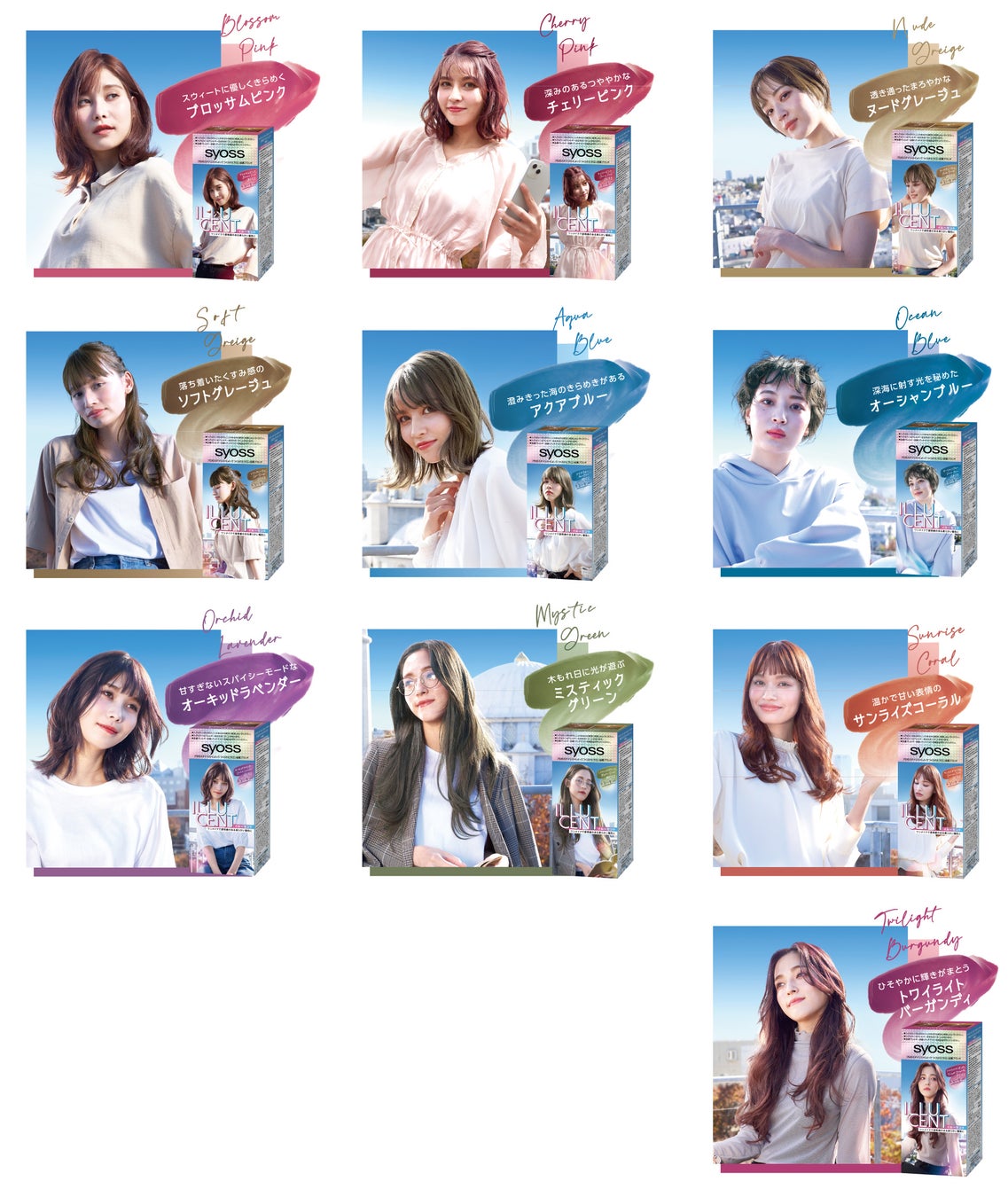 肌馴染みの良いヌードグレージュからブロッサムピンク、アクアブルーなどの暖色系、寒色系まで揃えた全10色展開。まるでサロンのような明るく高発色のカラーで、ブリーチなしでも透明感のある仕上がりと色持ちを実現します。