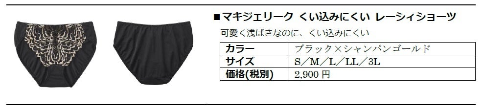 バストを丸く整える『背中すっきり つつまれ美乳ブラ』に新色が登場。昔から美しい女性の代名詞とされるピオニー(芍薬)をイメージしたレースをあしらい、「女性の美しさ」を表現しています。今回は人気のブラックをベースに、シャンパンゴールドと、オフホワイトを配色したレースが上品なアクセントのデザインです。