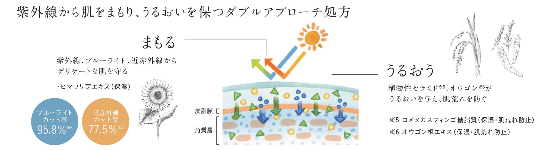 肌を紫外線・光ダメージから守りながら、天然由来の保湿成分でバリア機能を守ってうるおす、ダブルアプローチ処方を採用。ブルーライト・近赤外線から肌を守りながら、植物性セラミド※5が肌にうるおいを与え、乾燥による肌荒れを防ぎます。水分保持力のある健康的な肌をキープします。