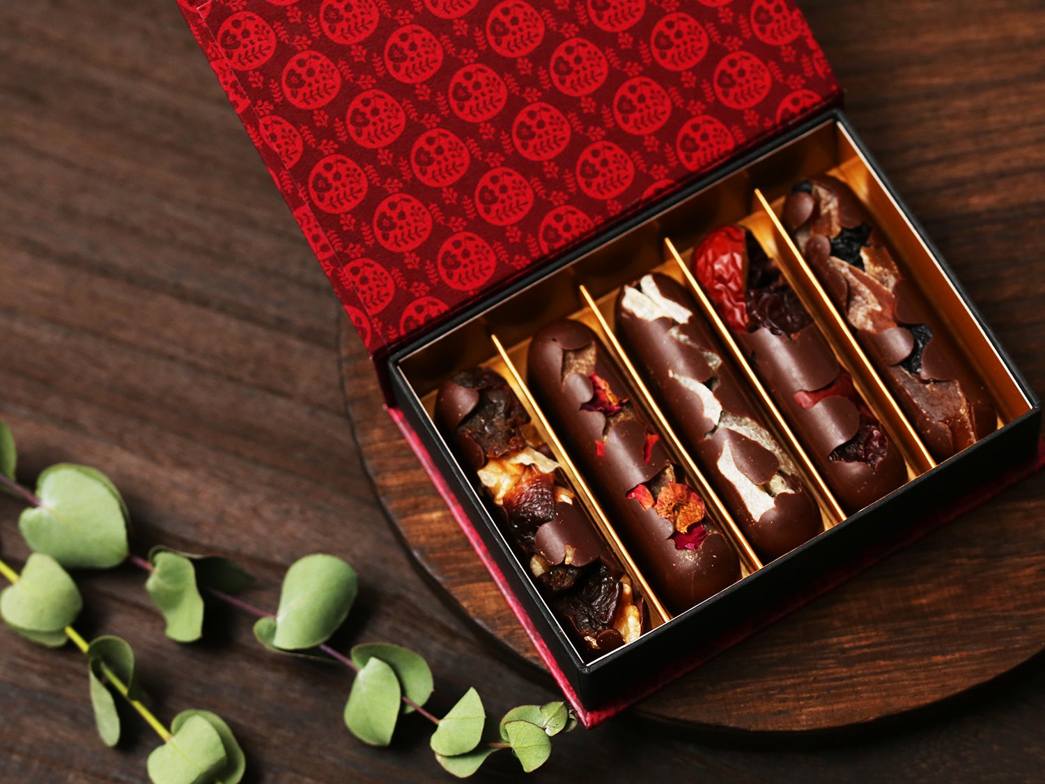チョコレートのベースには、カカオに加え、アーモンド、チアシード、ココナツ、きなこ、抹茶、ポピーシード、昆布などの栄養豊富なスーパーフードがたっぷり。さらに、なつめ(棗)やさんざし(山査子)、生姜などの薬膳食材を、ごろっと大きな果肉のままチョコレートに。