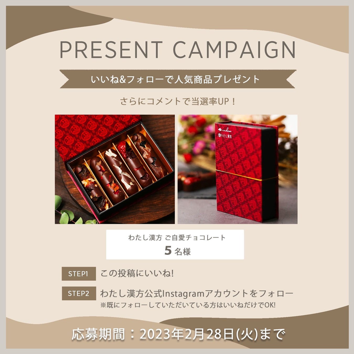 わたし漢方株式会社(本社:東京都渋谷区、代表取締役社長:丸山 優菜)が運営する、薬剤師とLINE上で相談して自分にあった漢方薬を配送してくれるオンライン漢方相談サービス『わたし漢方』( https://www.watashikampo.com/ )は、世界一やさしいチョコレート『andew』( https://andew.co.jp/ )を展開する株式会社SpinLife(本社:北海道札幌市、代表取締役:中村 恒星)が共同開発。代官山 蔦屋書店のPOP-UPで話題となった「ご自愛チョコレート」を公式インスタグラムへの「いいね!」&フォローで5名様にプレゼントいたします。