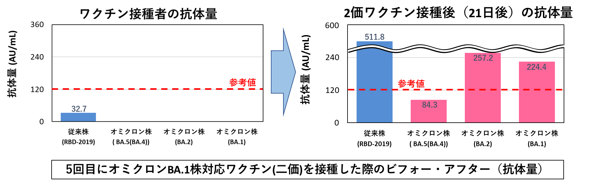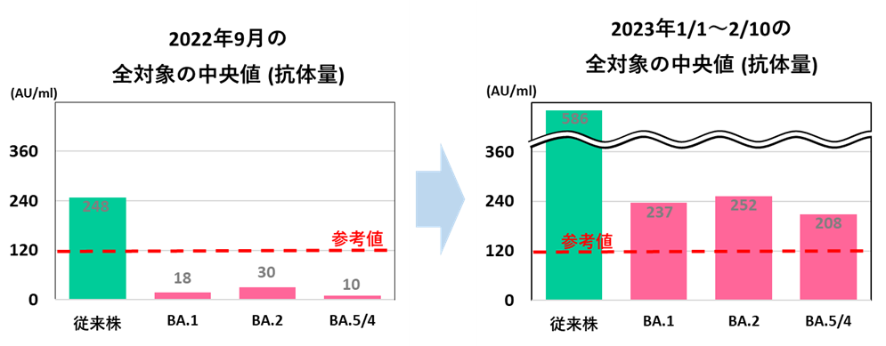 当初(9月の対象者50名)、オミクロン株に対する抗体量(中央値)は、とても少ない状態でした。しかし、年明けから先週までの間(対象者110名)には、参考値[※1]を超えて大きく上昇しました。現在流行の大半をしめているBA.5に対する抗体も一定量検出されており、これは、10月に開始されたオミクロン株(BA.5)対応ワクチン接種の影響が大きいと考えられます。