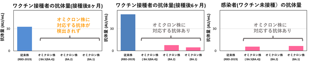オミクロン株に対応する抗体の保有状況がそれぞれ異なっていることが分かりました。上図より、従来型ワクチン(1価)の接種者であるAさんとBさんで、オミクロン株に対応する抗体を保有するBさんと、検出されないAさんが確認されました。ただ、Bさんも、現在流行しているBA.5に対応する抗体が検出されていませんでした。そして、ワクチン未接種のCさんからは、オミクロン株に対する抗体が検出され、感染していたことが分かりました。また、Aさんについて、オミクロン株対応ワクチン(2価)を接種した後に追加調査をしたところ、オミクロン株に対する抗体量(抗体価)が上昇していました。