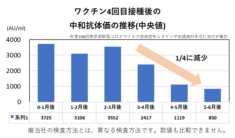 本調査の一方で、ワクチン接種後の個人にフォーカスを当ててみますと、ワクチン接種後に高い抗体量であったとしても、その後は抗体が減少することが知られています。第108回東京都新型コロナウイルス感染症モニタリング会議の報告(会議資料をもとに下図を作成)では、4回目接種後の中和抗体価(RBD)は、接種3ヶ月後までほぼ横ばいで、その後に減衰し、5-6ヶ月で約1/4の抗体量(抗体価)ととなることが明らかにされています。目安として、接種後約4ヶ月が経過した際には、感染に対して警戒が必要になってくると思われます。
