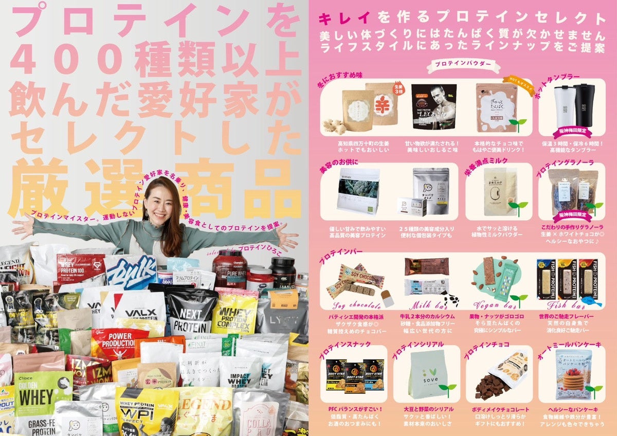これまでに400種類以上のプロテインを飲み、「マツコの知らない世界」や「めざましテレビ」など多くのメディアで出演実績のある運動しないプロテイン愛好家「プロテインひろこ」が厳選したアイテムが並びます。