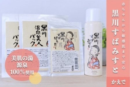 黒川温泉は、温泉郷全体を一つの旅館としてプロデュースした大人気のスポットです。「黒川温泉美人セット・かえで」は、化粧水とパック・入浴剤がセットとなった、黒川温泉の魅力を余すところなく楽しめるセットパックです。特に化粧水は、源泉を100%使用し、余計なものが入っていないので安心して全身に使えます。
