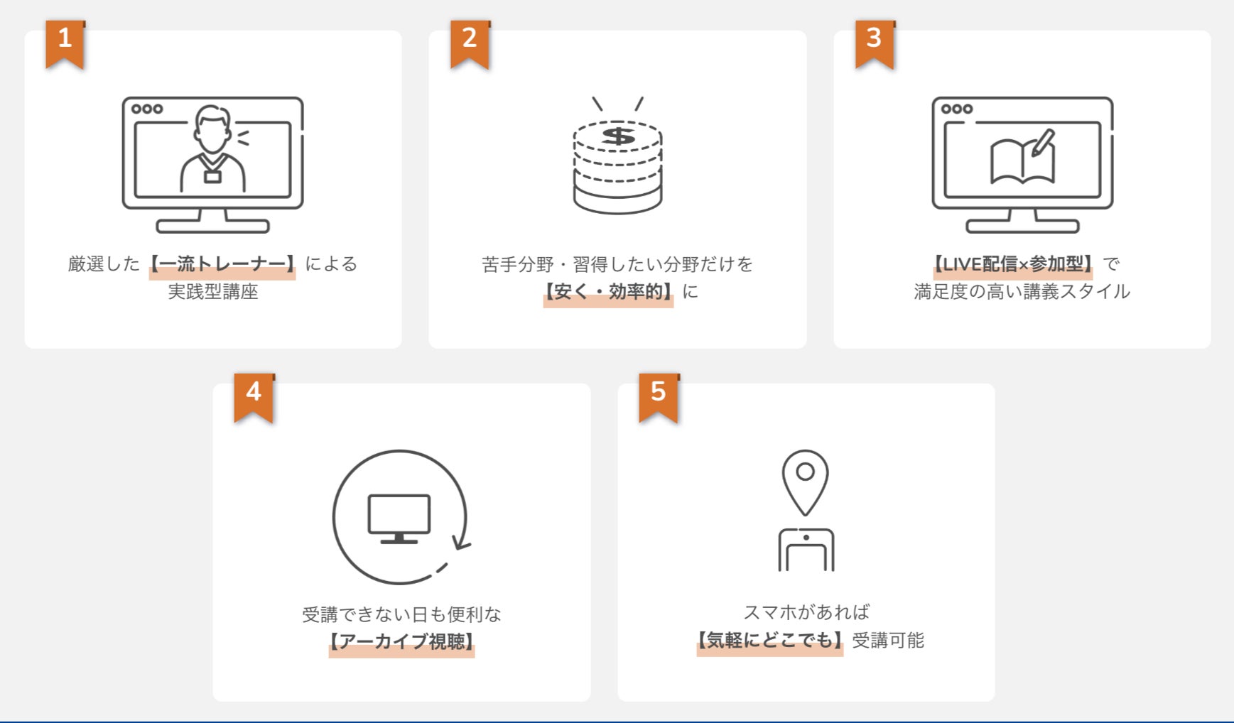 当スクール最大の特徴は、『講師の質』です。当社が直接企業や個人の一流トレーナーに講師を打診し、模擬授業によって依頼するか否かをシビアに判断しております。