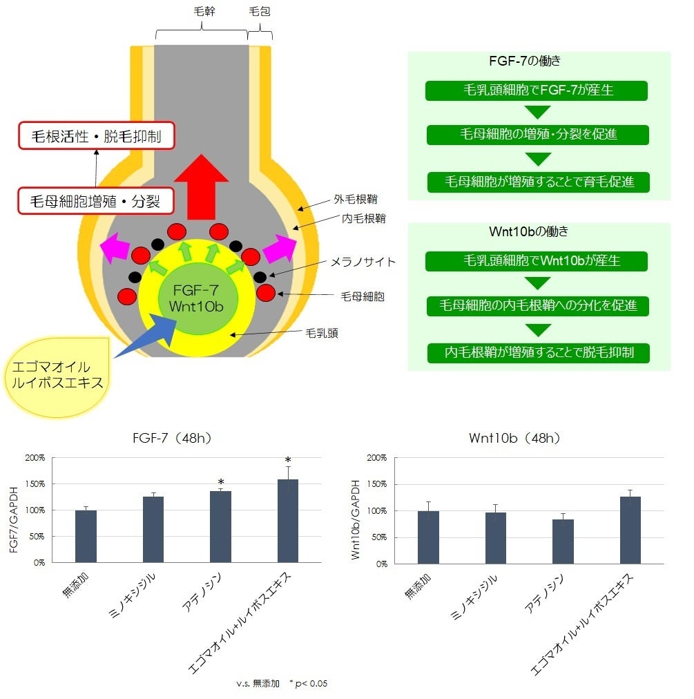 育毛効果を示した成分の作用機序の確認と、これらの成分の組合せによる育毛関連遺伝子の発現促進効果の確認は、日華化学にてヒト由来毛乳頭細胞への成分添加試験にて行いました。検討の結果、無添加、ミノキシジル、アデノシンに比べて、α‐リノレン酸を多く含むエゴマオイルとルイボスエキスの組合せにおいて、毛乳頭細胞から産出され、毛母細胞に作用し、毛母細胞の増殖・分裂を促すことで毛幹を成長させ、毛髪の太毛化を維持・促進させる細胞成長因子の「FGF-7」の発現量は有意に増加し、毛乳頭細胞から産出され、毛母細胞の毛幹や内毛根鞘細胞への分化を担い、毛髪を抜けにくくする因子「Wnt10b」の発現量は増加傾向が認められました(図3)。