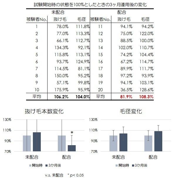 実使用における育毛作用効果の確認のためのヒト頭皮塗布試験は、日華化学にて組合せによってより高い育毛作用を示したエゴマオイルとルイボスエキスを配合した剤と、比較対照として未配合の剤で3か月間の塗布試験を行い、抜け毛数の確認と太さ計測を行いました。試験開始前の状態を100%として3か月後の変化量を算出した結果、未配合の剤を塗布した群に比べて、エゴマオイルとルイボスエキスを配合した剤を塗布した群において、有意な抜け毛数の減少と太毛化の傾向が確認されました(図4)。