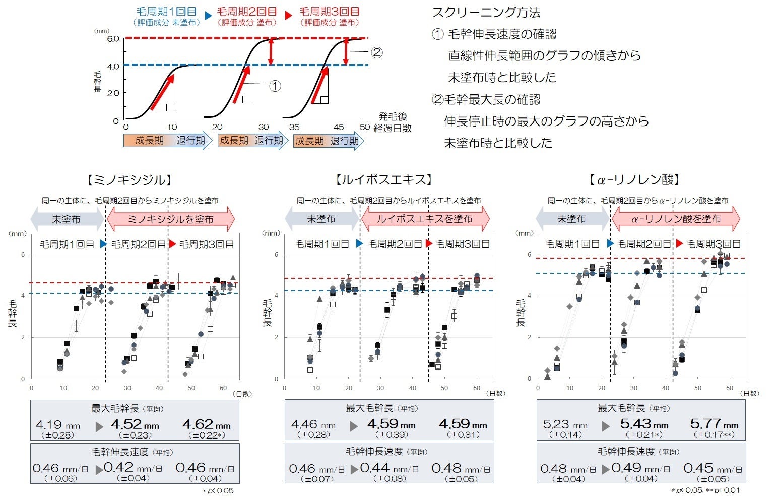スクリーニング試験を実施した結果、未塗布に比べて、ミノキシジル(既に育毛効果が確認されている)およびα-リノレン酸などを多く含む特定の植物オイルやルイボスエキスなどの特定の植物エキスにおいて最大毛幹長が有意に上昇することが明らかとなりました(図2)。