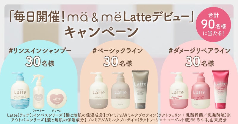 クラシエホームプロダクツの、おとなと子どもが一緒に使えるヘアケア&スキンケアアイテムを展開する「mä&më Latte (マー&ミー ラッテ)」がインバスヘアケアシリーズのリニューアルを記念して、「毎日開催!mä&më Latteデビュー」Twitterキャンペーンを2023年2月15日(水)から開始いたします。新しくなったインバスヘアケアのセットを抽選で合計90名様にプレゼントいたします。