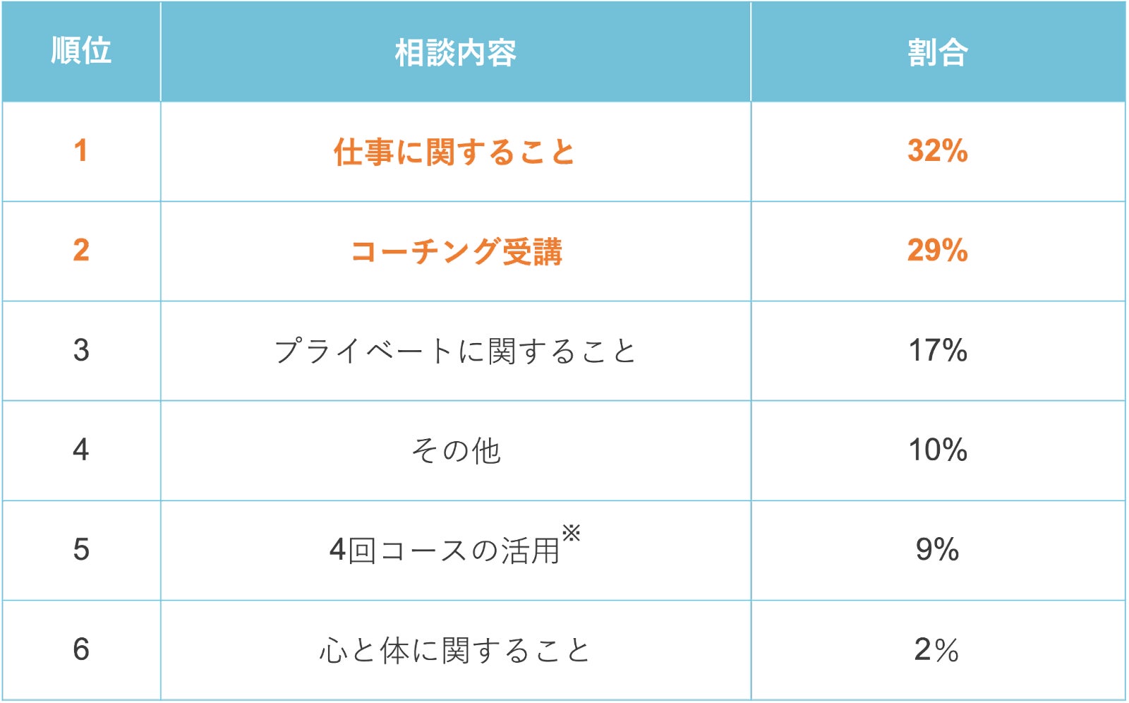 - 2023年1月の相談内容は、1位「仕事に関すること」32%、2位「コーチング受講」29%、3位「プライベートに関すること」17%