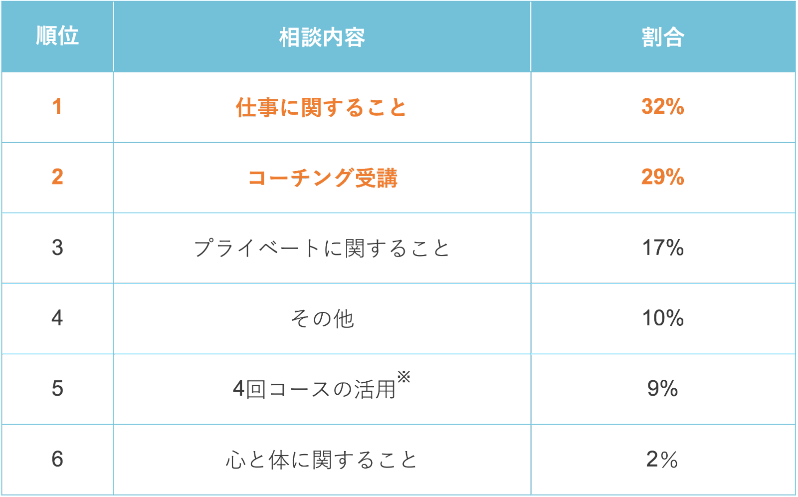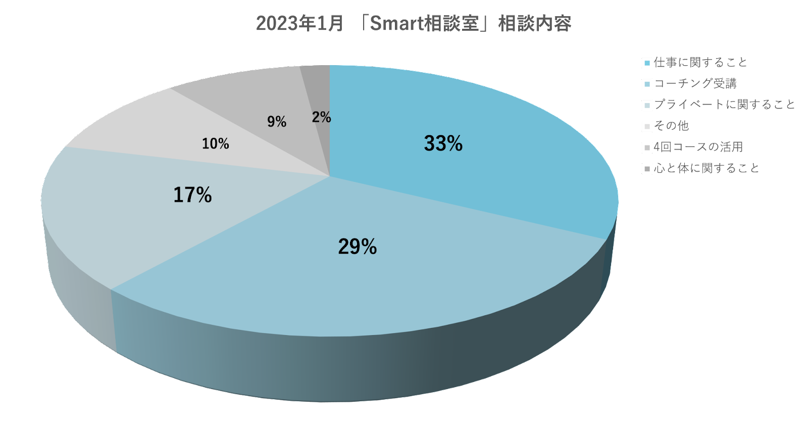 - 2023年1月の相談内容は、1位「仕事に関すること」32%、2位「コーチング受講」29%、3位「プライベートに関すること」17%