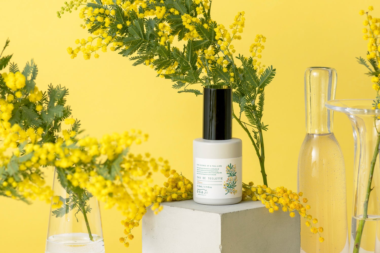 OSAJIは、その可愛らしいお花をイメージし、感謝や春の暖かな幸福感を纏えるように、シーズナルフレグランスとしての〈ミモザ〉をお届けいたします。