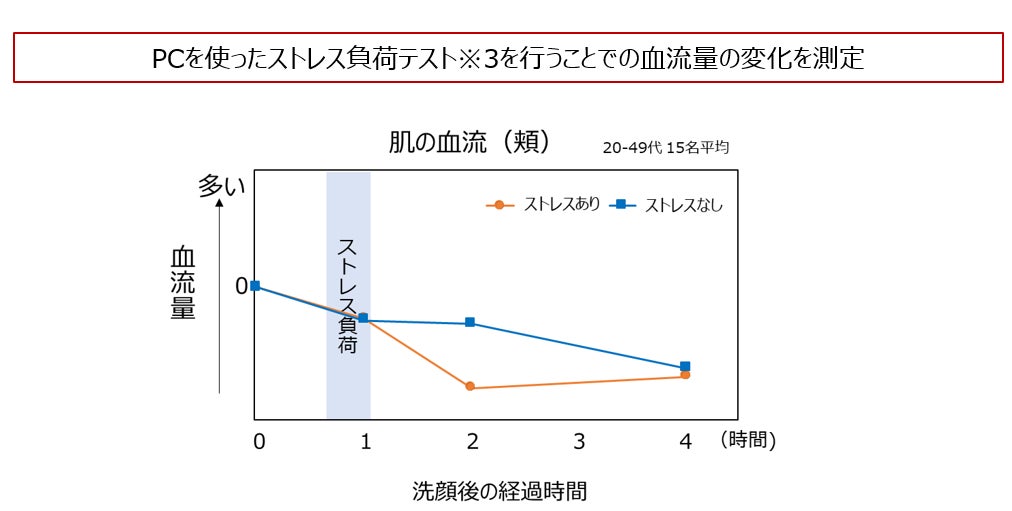 他にも、正常ではない角層細胞の割合が増えることや、肌のバリア機能が悪化することもわかっています。また影響は肌表面だけでなく、血流量にも影響。PCを使ったストレス負荷テスト※3を行い血流量を測ったところ、ストレス負荷がかかると、血流量が低下することもわかりました。これらのことから、デジタル疲労は肌荒れなどの原因となることが示唆されました。