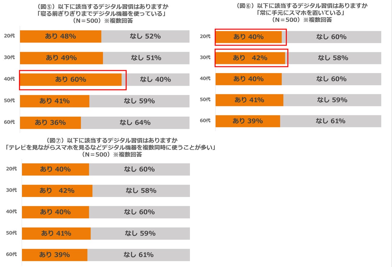 デジタル習慣別にみると、「寝る前ぎりぎりまでデジタル機器を使っている」という人が多かったのは、40代で60%。20代と30代も約50%はこの習慣を挙げており、「寝る前デジタル」が当たり前になっている人が多くいます(図⑤)。また20代で48%、30代では56%が常に手元にスマホがある状態だと回答しました(図⑥)。ほかにも、どの世代においても、約3人に1人は「テレビを見ながらスマホを見るなどデジタル機器を複数同時に使うことが多い」という傾向が見られました(図⑦)。