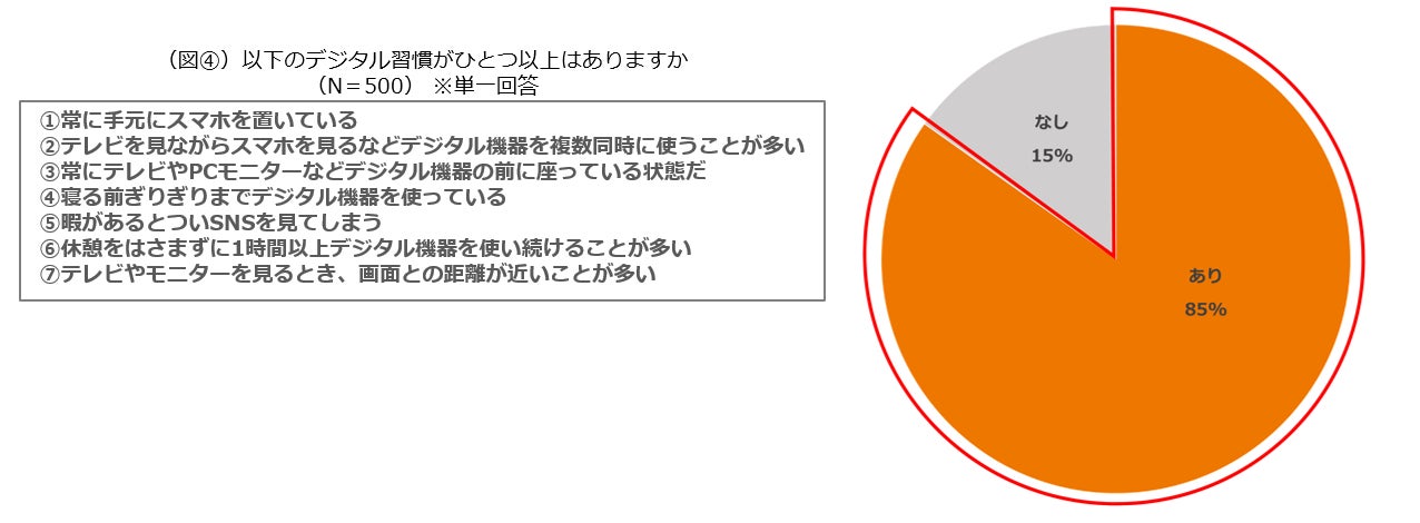 「常に手元にスマホを置いている」「テレビを見ながらスマホを見るなどデジタル機器を複数同時に使うことが多い」「常にテレビやPCモニターなどデジタル機器の前に座っている状態」「寝る前ぎりぎりまでデジタル機器を使っている」といったデジタル習慣があると答えた人が85%にのぼりました。(図④)