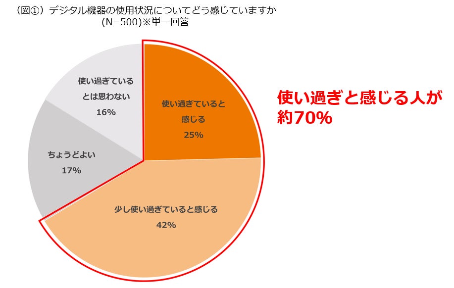 デジタル総利用時間の平均は6.22時間。起きている時間の約3分の1の時間に該当することが明らかになりました。使用状況に対し、全体の約70%は「デジタル機器を使い過ぎている」と実感しています(図①)。