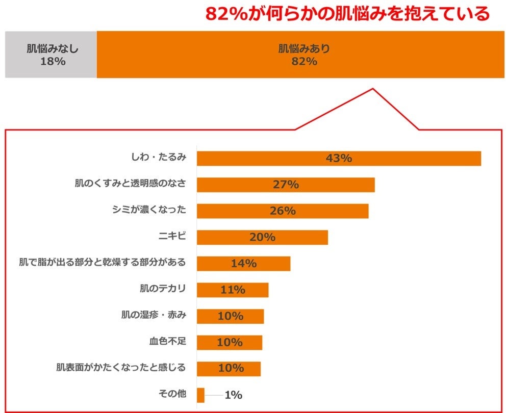 “デジタル漬け“状態の女性の80%以上は何かしらの肌悩みを抱えており、デジタル疲労の影響が出ていると考えられます。特に多かったのは「しわ・たるみ」(43%)、「肌のくすみと透明感のなさ」(27%)、「シミが濃くなった」(26%)といった肌悩みでした(図⑧)。