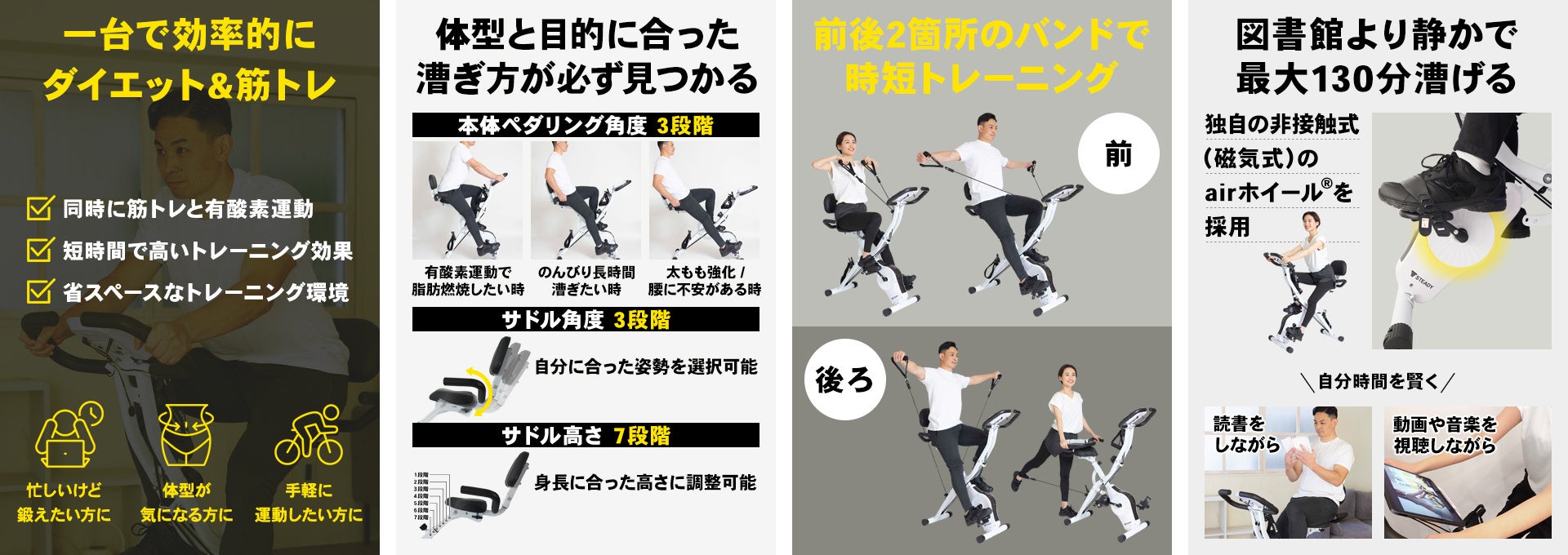 – 一台で効率的にダイエット&筋トレ:フィットネスバイクとエクササイズバンドを一台に凝縮した多機能モデル。全身の有酸素運動と筋力トレーニングが同時に行えるため、短時間で高いトレーニング効果が期待できます。トレーニングに効率性を求める方やトレーニング時間を短縮したい方、またトレーニング環境をスマート&コンパクトに整えつつ、全身をしっかりと鍛えたい方に特にオススメです。