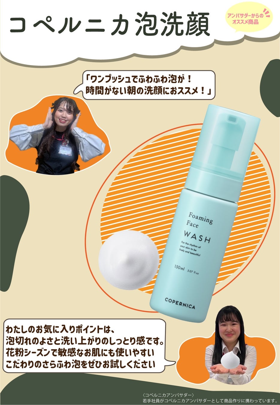 当社は2022年3月から、性別や年齢に関係なく重要な「角層バリア機能や皮膚表面環境」と、毛穴黒ズミや乾燥、ニキビなど「Z世代に多い肌悩み」に着目した「コペルニカ」を販売しています。当初はスキンケア売場のみの販売でしたが、現在はZ世代向けコスメや男性スキンケア売場にも、展開を拡大しています。既存品の「コペルニカ クレイ洗顔」よりも、「肌への刺激や洗い流した後のつっぱり感が少ない洗顔が欲しい」との要望から、泡洗顔を企画・開発しました。