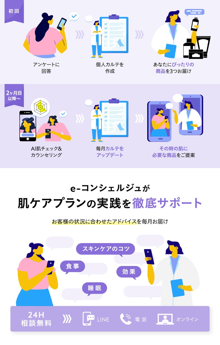 最新のAI肌診断とe-コンシェルジュによる肌解析で、あなたの肌に合ったスキンケアと、その時の肌に最適なお手入れ方法をパーソナライズ提案する、完全会員制の月額定額制サービスです。e-コンシェルジュによる寄り添うサポート体制と、お客様ごとに違う生活環境やお食事の要素を取り入れた個別プログラムの構築で、理想の肌にコミットします。