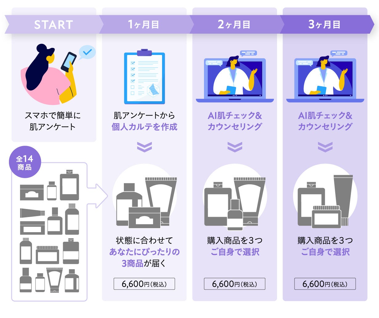 定額6,600円(税込)で、全14アイテムの中から3商品を組み合わせて毎月お届け。