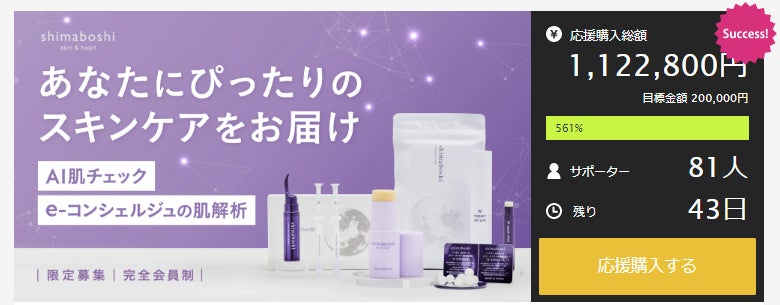 多くのお客様のお声を受け、新体制での再出発を叶えたスキンケアブランド「shimaboshi」。この度、会員制パーソナライズドスキンケア【shimaboshi ME】をクラウドファンディングサイト”Makuake”にて販売をスタートさせ、開始1時間で目標金額を達成いたしました。