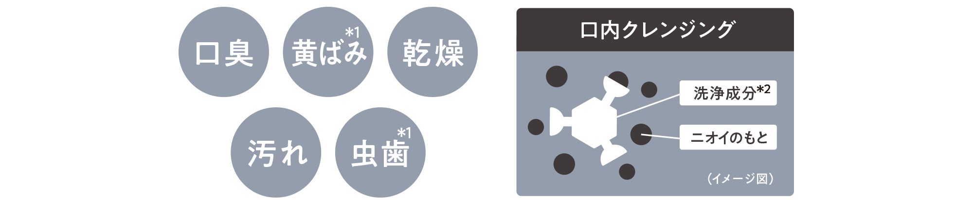 歯ブラシが届きにくい部分のニオイのもと、ネバつきをスッキリ洗い流し*1、息きれいが持続。