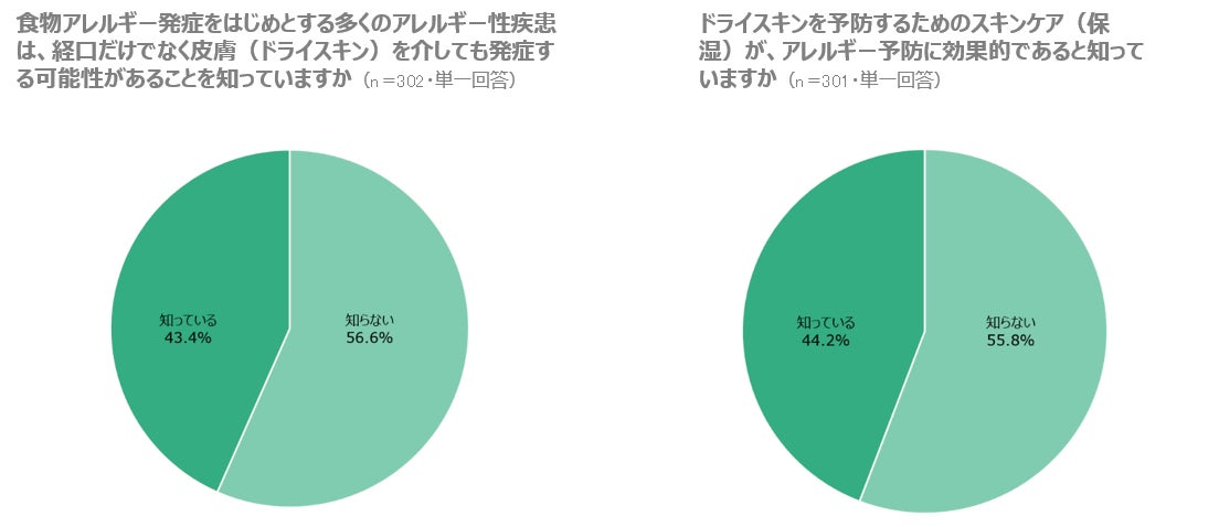 アレルギーは、経口だけでなく皮膚(ドライスキン)を介しても発症する可能性があることを知らない」と回答した人と「ドライスキンを予防するためのスキンケア(保湿)が、アレルギー予防に効果的であることを知らない」と回答した人は6割近くも!