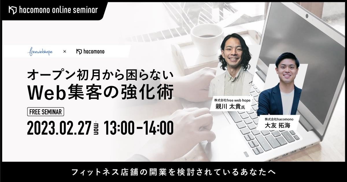 free web hopeが手掛けたフィットネスジムやパーソナルジムなど店舗集客の実績と、hacomono様が提供するオールインワン基幹システムのご紹介をいたします。