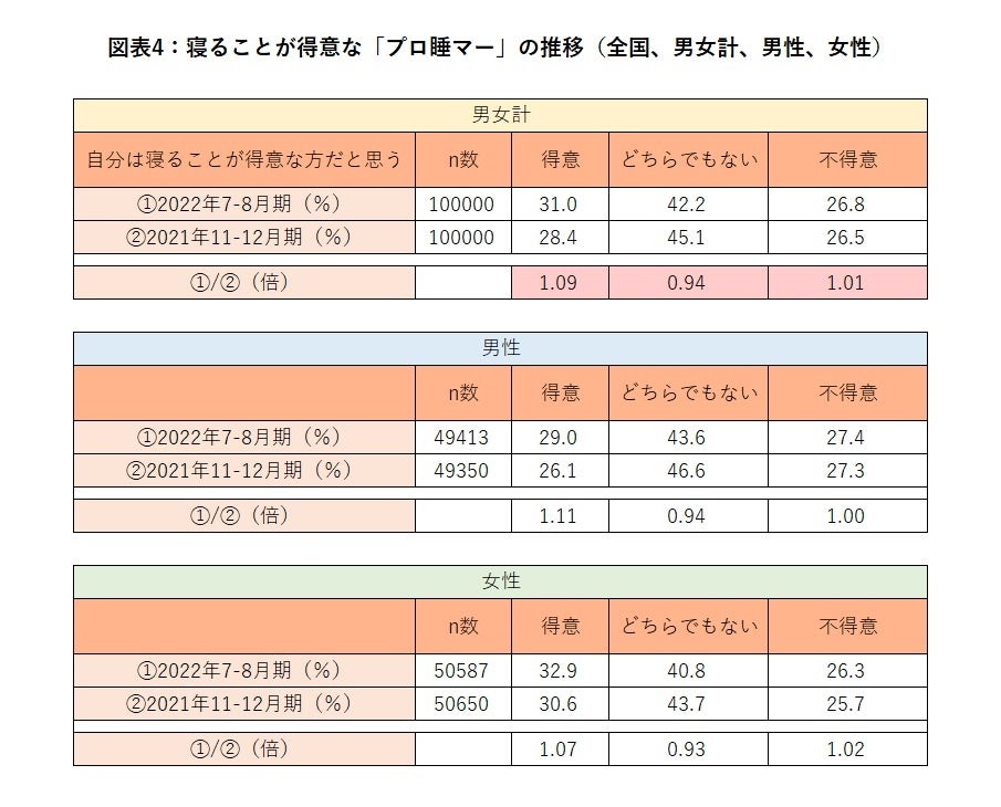 ここでは、寝るのが得意な方を「プロ睡マー」とし、全体、男女別で見てどれだけいるかを見ていきます。まず、全体におけるプロ睡マーは、31.0%となっており、2021年と比較して1.09倍増加しています。