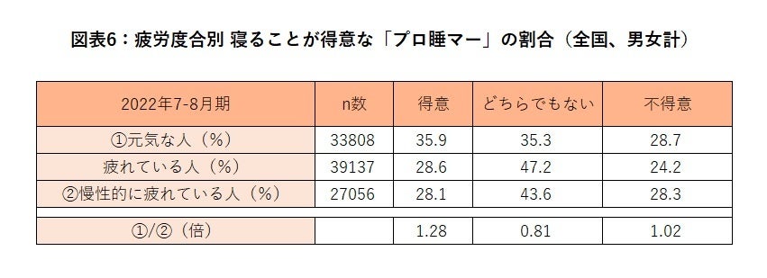 疲労度合別に見ると、元気なプロ睡マーは35.9%、慢性的に疲れているプロ睡マーは28.1%と、1.28倍多い結果になりました。寝ることが得意だから必ずしも元気というわけではなく、複合的に休養を取り入れていくことで、より元気なプロ睡マーが増えていくのではないかと考えられます。