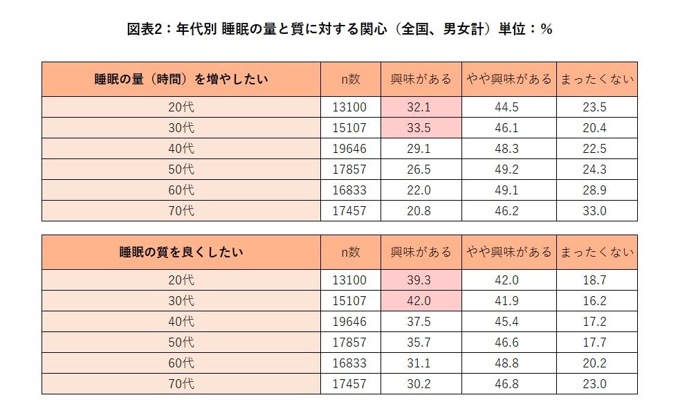 今回、調査結果から睡眠への関心や環境について分析しました。その結果、睡眠の「時間」を増やすよりも「質」を高めたい方が多く、さらに30代が睡眠状況の改善に対する関心が最も高いことがわかりました。