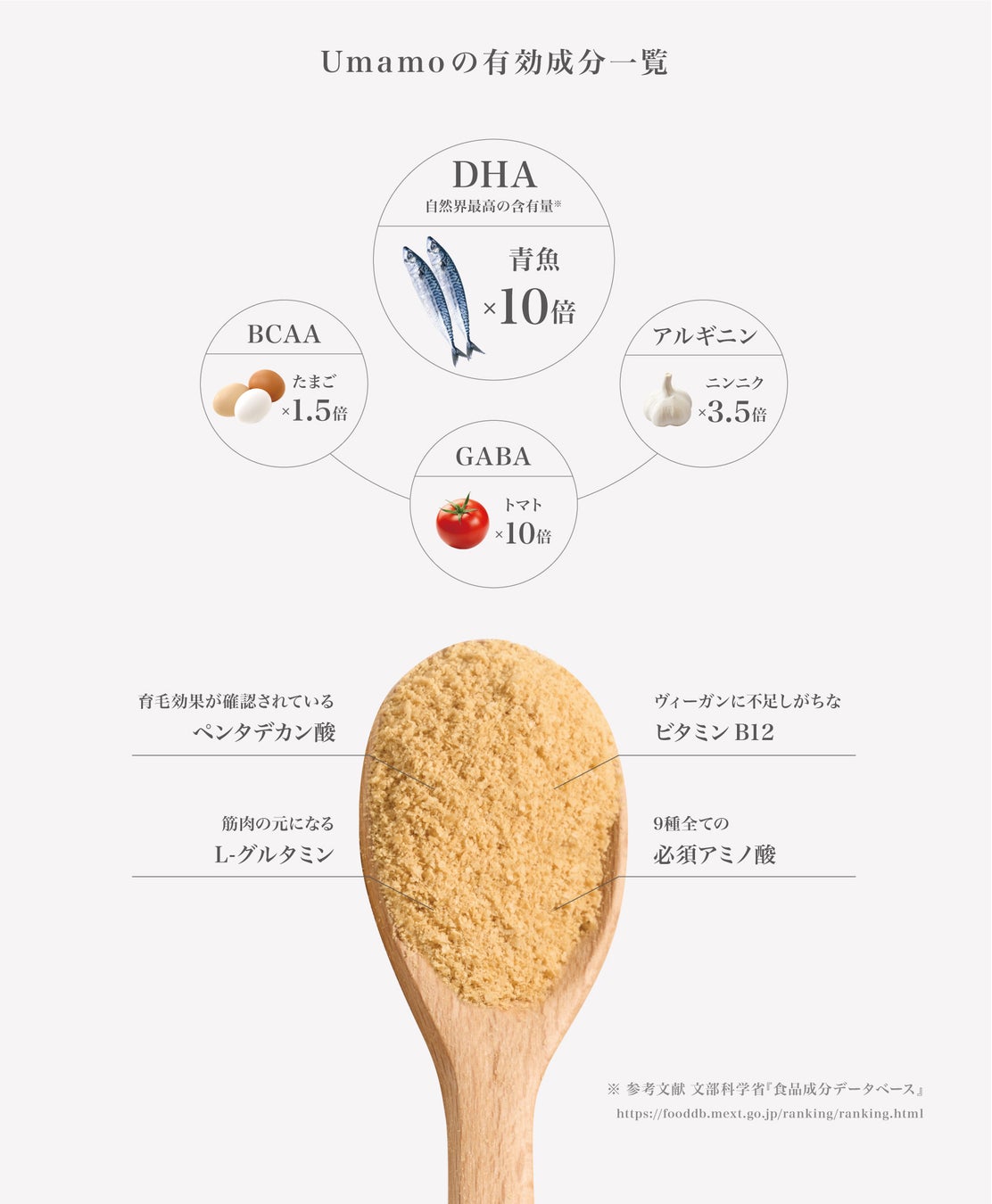 またUmamoは、DHAだけではなくGABAや、アルギニン、プラントベースのライフスタイルでは不足しがちなビタミンB12などを様々な栄養素も含みます。だからこそ、魚から摂るDHAとは違い、Umamoという自然の素材そのものから、DHAを初めとした豊富な栄養素を同時に摂って頂けると考えております。